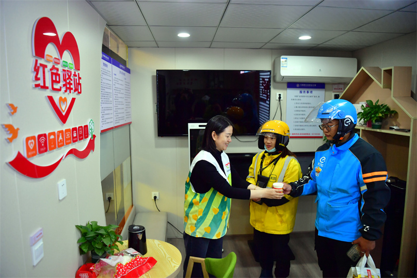 服務站內,社區志愿者將熱水遞給外賣員。人民網記者 時雨攝