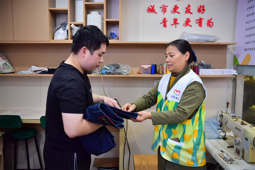 轄區居民將新買的褲子拿到服務站,準備讓服務站志愿者改褲腿。人民網記者 時雨攝