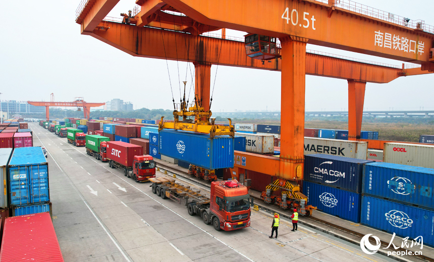 南昌國際陸港貨場,龍門吊在裝運進出口貨物集裝箱。人民網記者 毛思遠攝