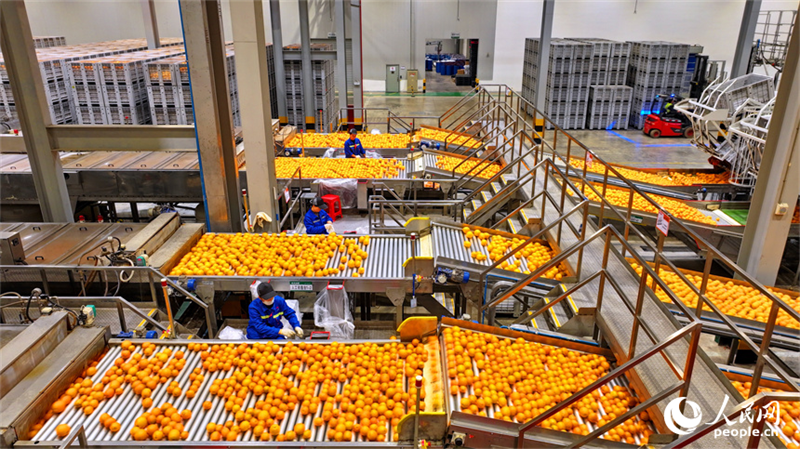 信豐縣的一家臍橙加工企業車間內,員工在智能分揀線上篩選贛南臍橙。朱海鵬攝