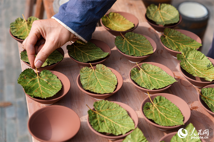 工匠將一片片桑葉放入上完釉的瓷坯中。