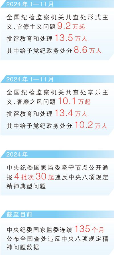 2024年9月查處22313起,10月查處22603起,11月查處28327起……中央紀委國家監委連續135個月公布全國查處違反中央八項規定精神問題情況月報數據。從數據來看,歲末年初“違規收送名貴特產和禮品禮金”“違規吃喝”“違規發放津補貼或福利”等問題的查處數量,較平常明顯升高。如今,什么問題突出就重點整治什么問題,各級紀檢監察機關深挖徹查“四風”頑疾,以鐵的紀律持續凈化節日風氣。