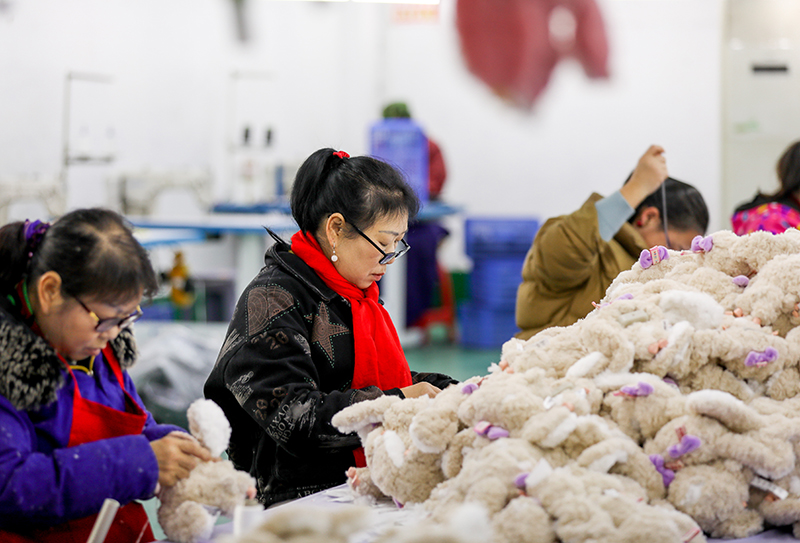 2025年1月7日,在江西省萍鄉市湘東區老關鎮一家玩具廠生產車間里,工人在布絨玩具生產線上趕制訂單。