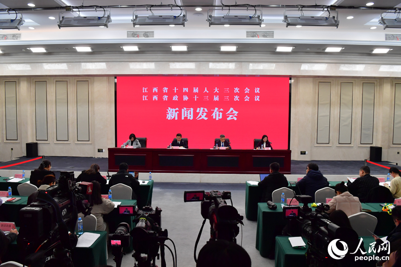 江西省十四屆人大三次會議、江西省政協十三屆三次會議新聞發布會在南昌召開。人民網記者 時雨攝