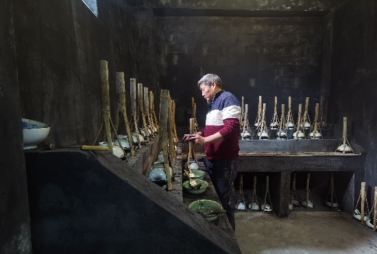 詹曉明在取煙以備做墨。本報記者王 丹攝