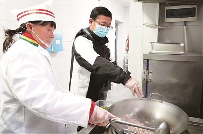 糜師傅邊切肉邊說:“得把肉塊切得小一點、薄一點,一會兒白菜不能用手撕,也要用刀切,切細碎。要不營養師那通不過!”