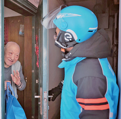 10點35分,兩份餐食放進電動車保溫箱后,騎手立即出發。第一單先送離食堂近些的趙老先生,不一會兒就到了?!澳?,您的餐到了?!瘪R志鵬邊敲門邊說道。趙老先生開門接過飯菜后表示感謝:“你們辛苦啊,天天送飯,小伙子真棒!”