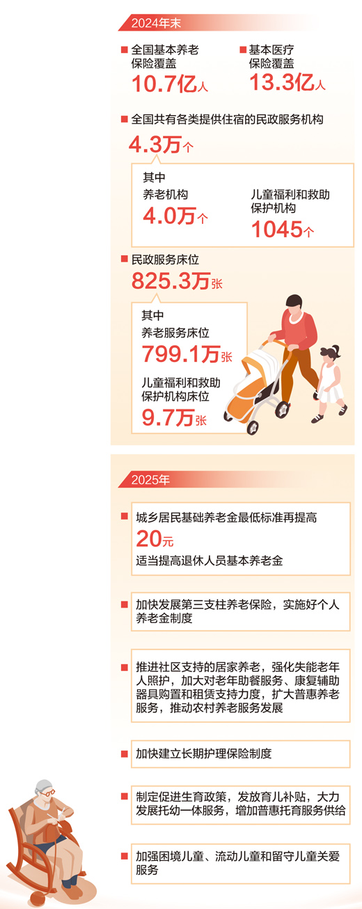 “一老一小”關乎民生、連著民心。2019年—2024年,全國財政用于養老服務和老年人福利方面的支出超過5600億元,年均增長11%。目前,全國提供托育服務的機構已近10萬個,托位約480萬個?!耙焕弦恍 狈站W織密織牢,托住穩穩幸福。