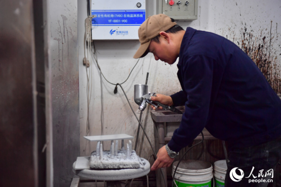 噴涂車間油漆工正在噴涂水性涂料。人民網記者 時雨攝