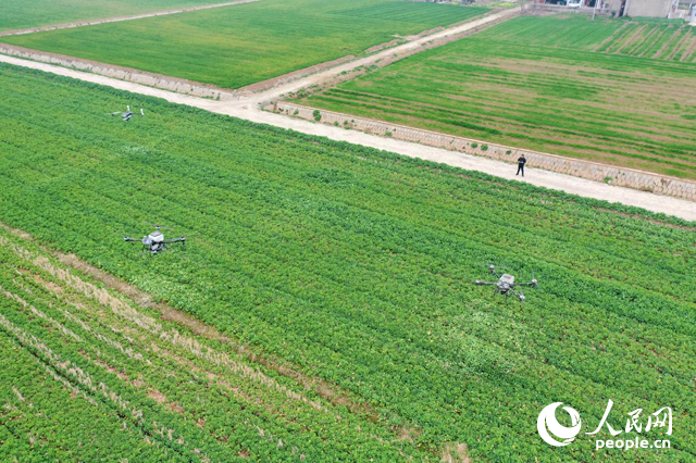 在安徽省望江縣漳湖鎮的油菜田里,無人機正在精準施肥。人民網記者 陳若天攝