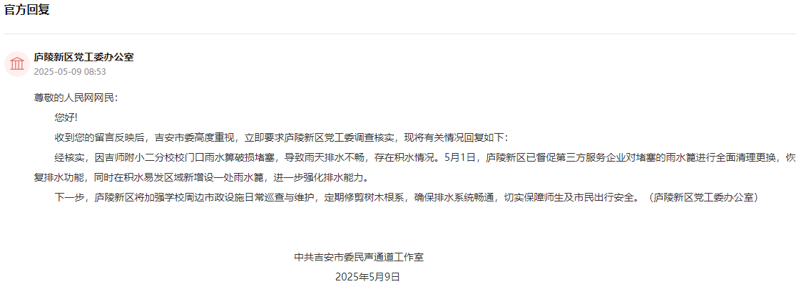 收到網友留言后,廬陵新區黨工委辦公室進行了回復。經核實,因吉師附小二分校校門口雨水箅破損堵塞,導致雨天排水不暢,存在積水情況。5月1日,廬陵新區已督促第三方服務企業對堵塞的雨水篦進行全面清理更換,恢復排水功能,同時在積水易發區域新增設一處雨水篦,進一步強化排水能力。