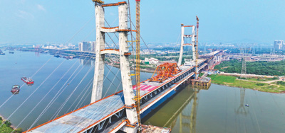 本報南昌5月20日電 日前,隨著最后一段焊縫焊接完成,由昌九城際鐵路股份有限公司建設、鐵四院設計、中鐵大橋局集團承建的昌九高鐵控制性工程隆興大橋(南昌揚子洲贛江公鐵大橋)單孔320米跨度西支主橋順利合龍。