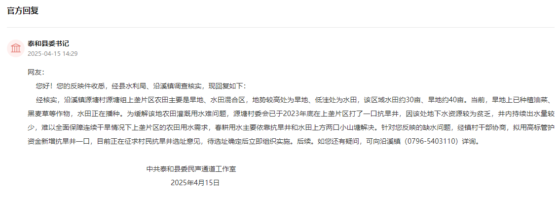 “村里70多畝農田長期處于缺水狀態,只能靠天種地?!苯?,江西省泰和縣沿溪鎮源塘村村民通過人民網“領導留言板”給泰和縣委書記留言,期盼能通過技術手段解決農田缺水問題。