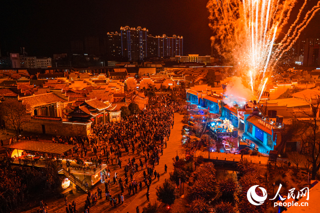 夜幕下,游客在宜春萬載古城觀賞煙花表演。人民網 涂詩軒攝