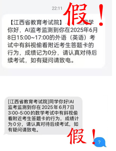 人民網南昌6月9日電 (記者時雨)近日,江西省部分高考考生收到所謂“江西省教育考試院”發送的短信,稱在考試中被AI監考發現其有作弊行為,成績記為0分。9日,江西省教育考試院緊急提醒:這是典型的高考短信詐騙!