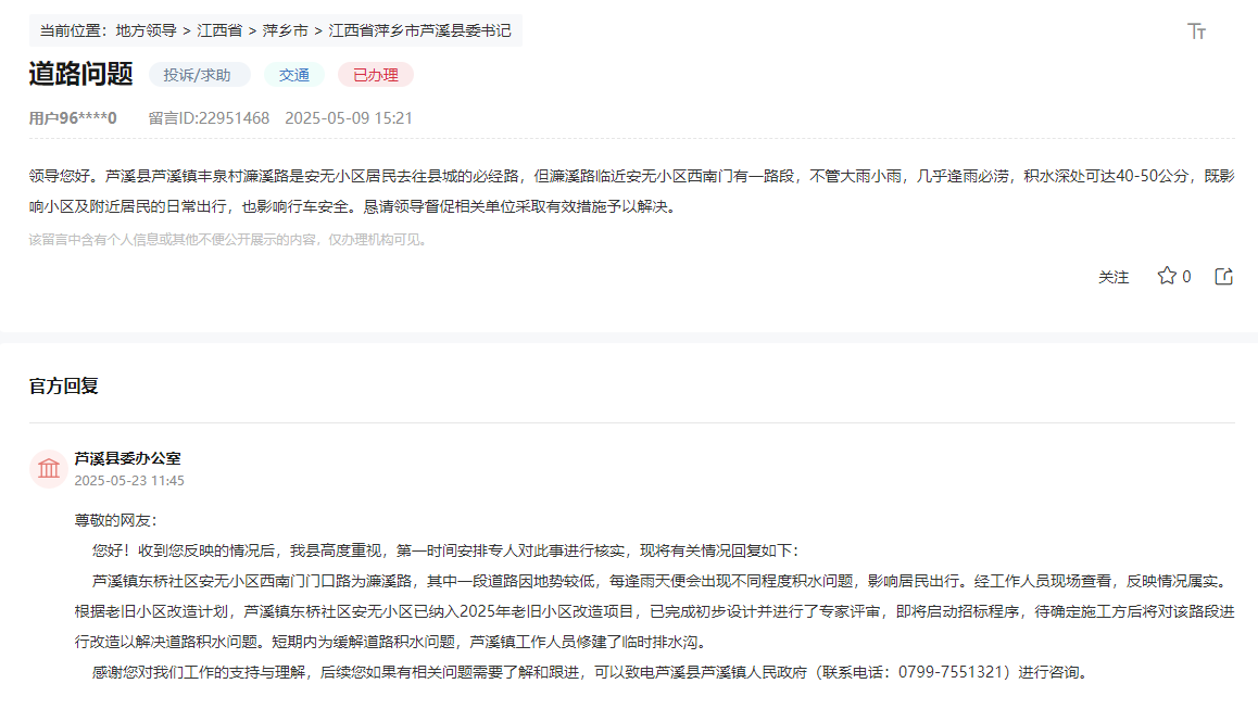 5月以來,江西省進入多雨期,多地群眾就雨季道路積水問題留言求助。相關部門針對群眾留言的問題開展實地走訪,并制定解決方案,切實化解群眾憂心事、煩心事。