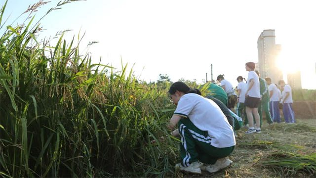 2024年7月,譚清芷和同學們一起在耕讀農場割水稻。