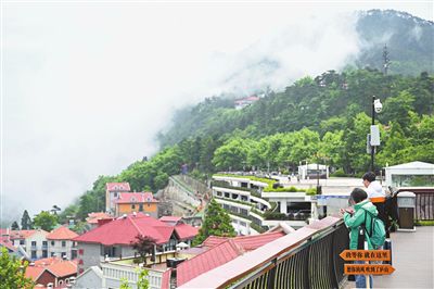 游客在廬山景區牯嶺街上的觀景臺拍照打卡。記者 蔡鋮歌攝