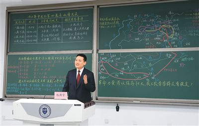 在程斯宇看來,教學實踐中要堅持板書與課件二者結合——板書用于框架梳理和重點強化,多媒體課件用于史料展示和提升教學效率?!耙屗颊n更有‘抬頭率’,四渡赤水板書案例證明,視覺化教學能有效吸引學生注意力。同時,黨史課里涉及大量史料圖片,課件能提供足夠的信息量?!彼f。