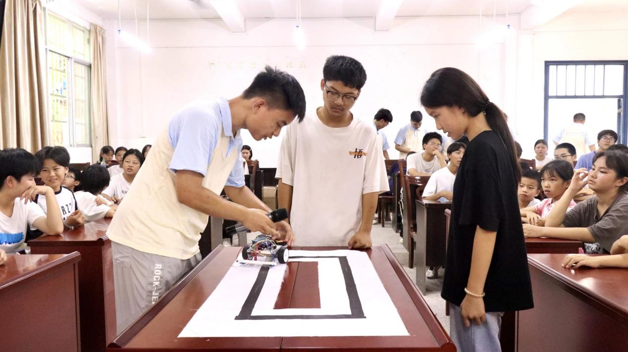 點陣屏互動、蜂鳴器演奏旋律、尋跡小車自主穩定行駛……系列有趣的活動與場景深深吸引了孩子們。面對“小車為什么會自己拐彎?”的疑問,隊員們將傳感器比作“眼睛”感知傾斜,控制器比作“大腦”快速計算調整電機,通俗解釋復雜的反饋控制算法。隊員們耐心答疑,手把手指導操作,扎實傳遞電學常識。