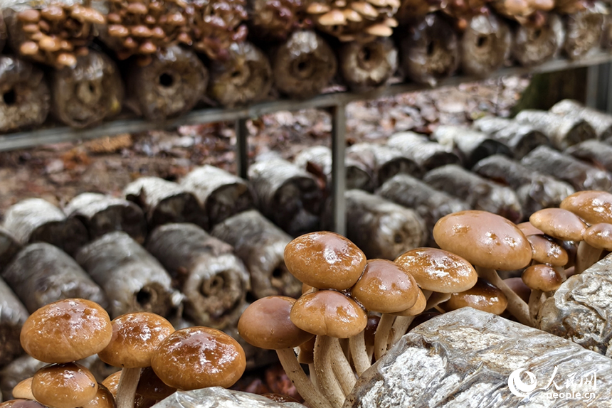 林下菌包長出的菌菇。人民網記者 時雨攝