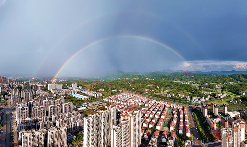 一場大雨后,會昌縣城上空出現一道絢麗雙彩虹。呂春華攝