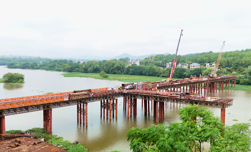 綿江大橋建設現場,架橋工人們抓緊施工。